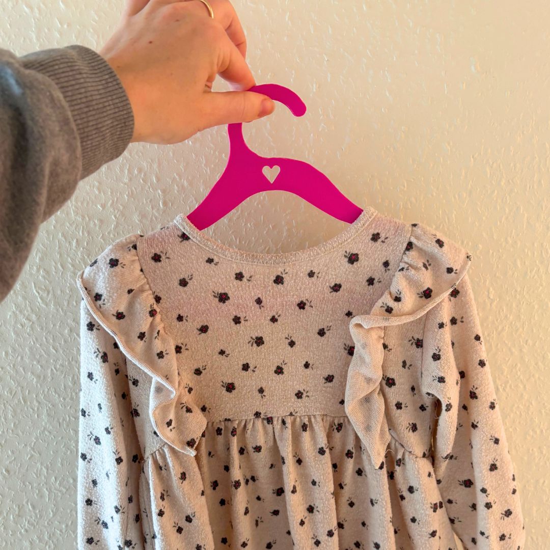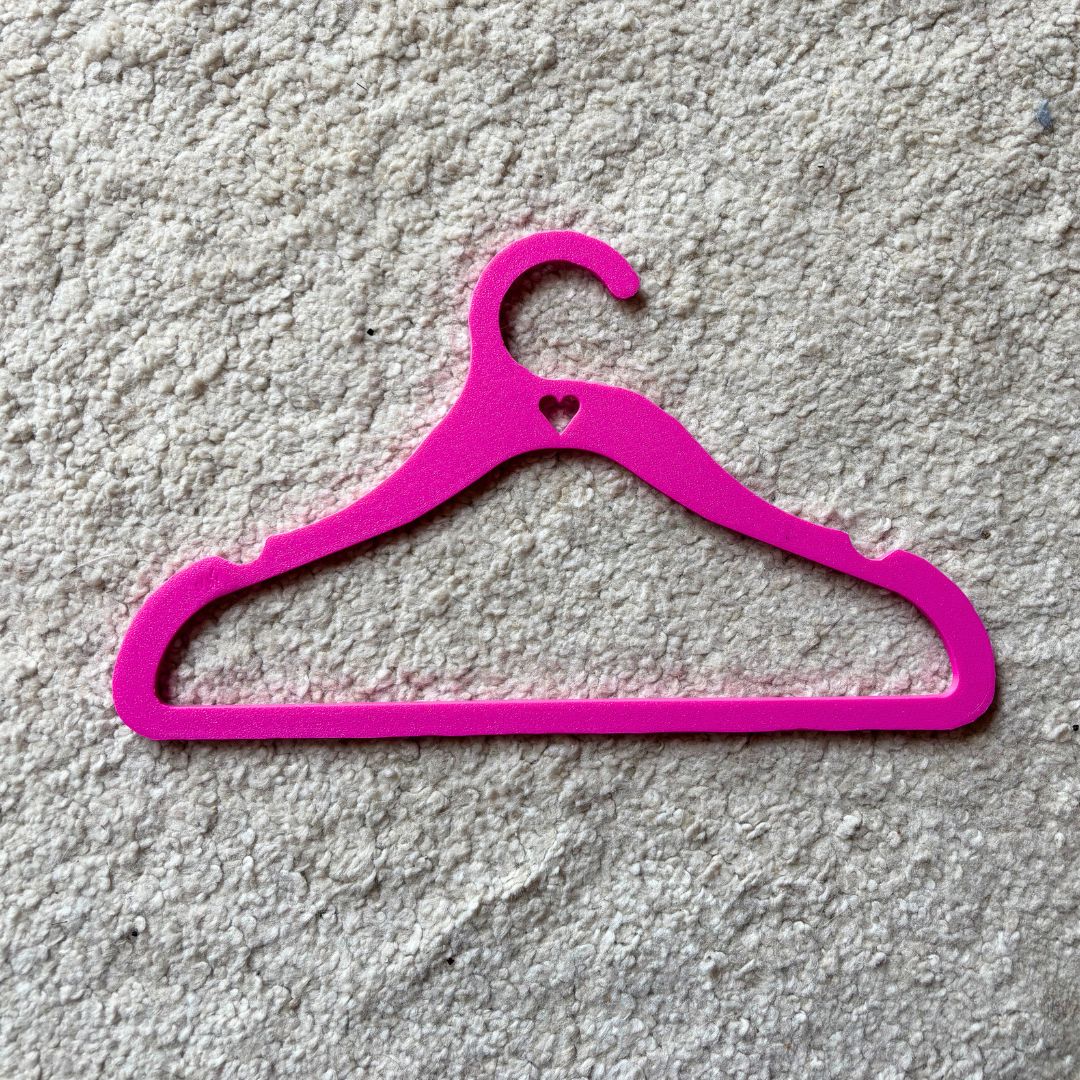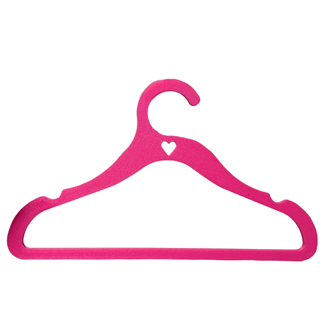 Bøjlen er udstyret med et hjerte i midten under bøjlekrogen – en sød og funktionel detalje, der også fungerer som et praktisk hul til at fastgøre fx hårbånd eller små accessories. For at sikre maksimal fleksibilitet er afstanden mellem bøjlekrogen og selve bøjlen minimal, så du let kan hænge selv lange kjoler, selv når bøjlestangen sidder lavt i skabet eller over en kommode.
